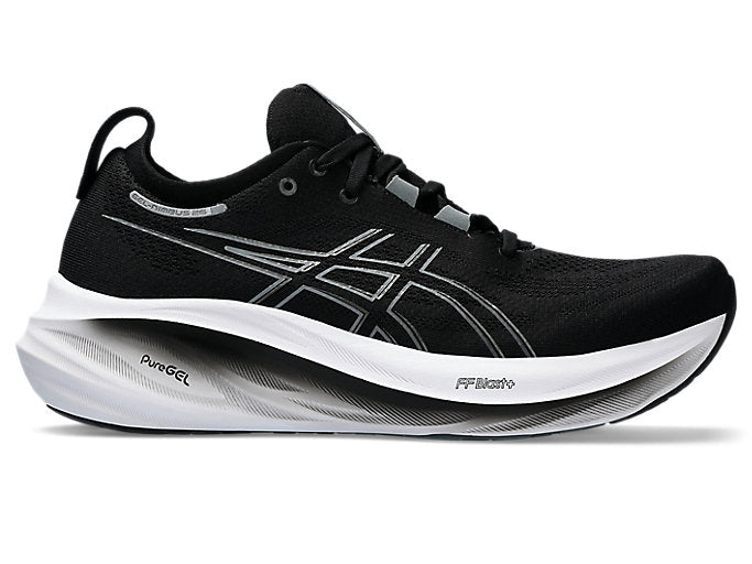 The GEL-NIMBUS® 26 shoe's soft cushioning properties help you feel like you're landing on clouds. This design is revamped to help create a softer and smoother running experience.A soft engineered knit upper comfortably wraps your foot while supplying advanced ventilation. Additionally, the knit tongue and collar help provide a soft and supportive feel.By using FF BLAST™ PLUS ECO cushioning, this trainer creates a lighter and softer cushioning experience with less of an impact on the environment.Lastly, ASICS®GRIP™ outsole rubber helps create better traction, improved softness, and advanced durability.